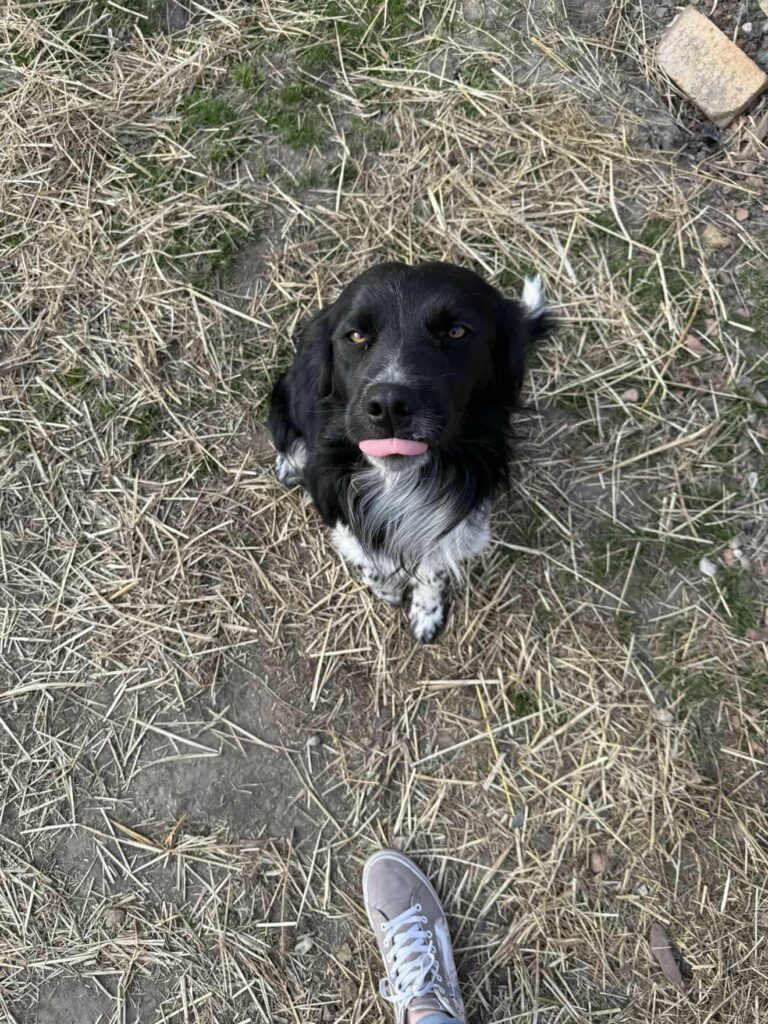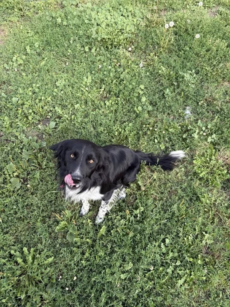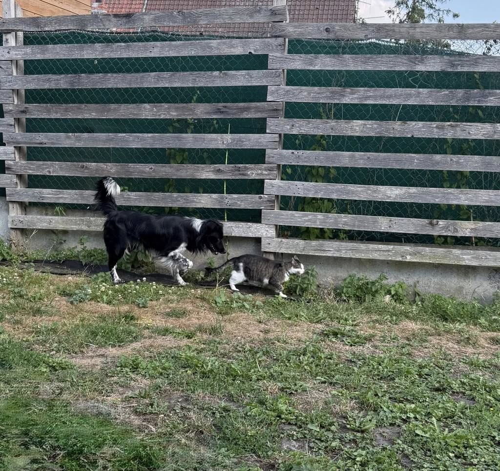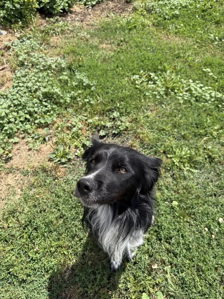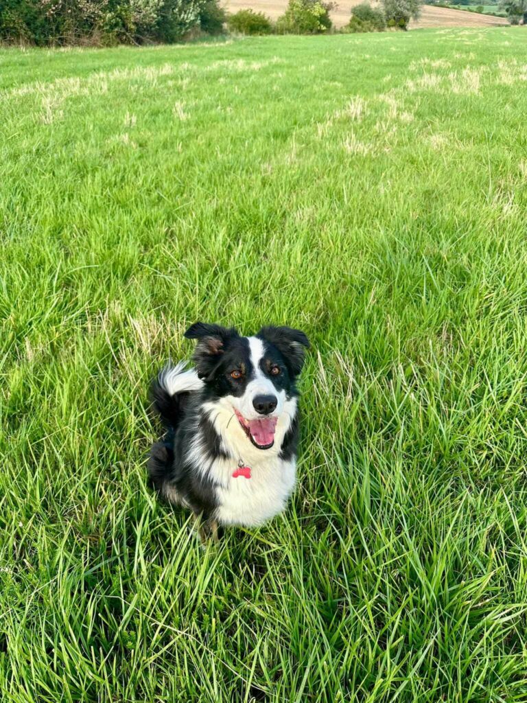 Avec les autres chiens, il est très amical, plutôt avec les femelles, et aime aller à leur rencontre, parfois avec beaucoup d’enthousiasme en tirant sur sa laisse pour dire bonjour. Il connaît bien les animaux de la ferme (vaches, chevaux) mais peut s’intéresser un peu trop aux poules, comme tout bon Border Collie curieux !