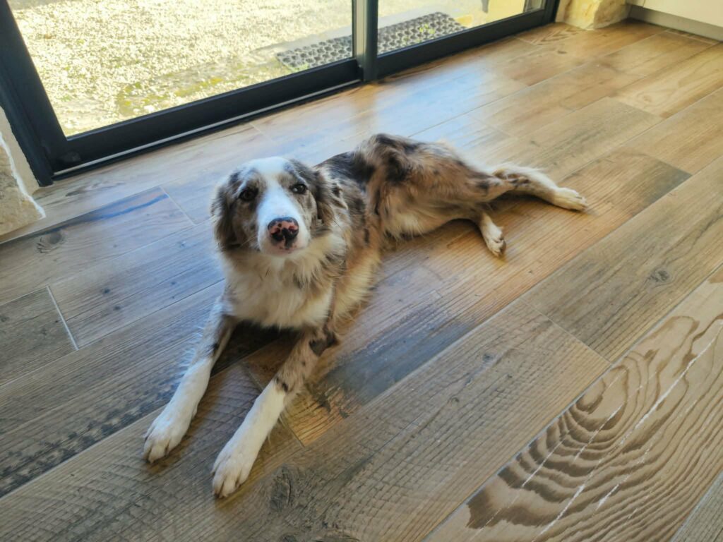 Lors des absences, Titus reste sagement dans son enclos. Il peut aboyer un peu au départ, puis se calme rapidement pour aller se reposer.